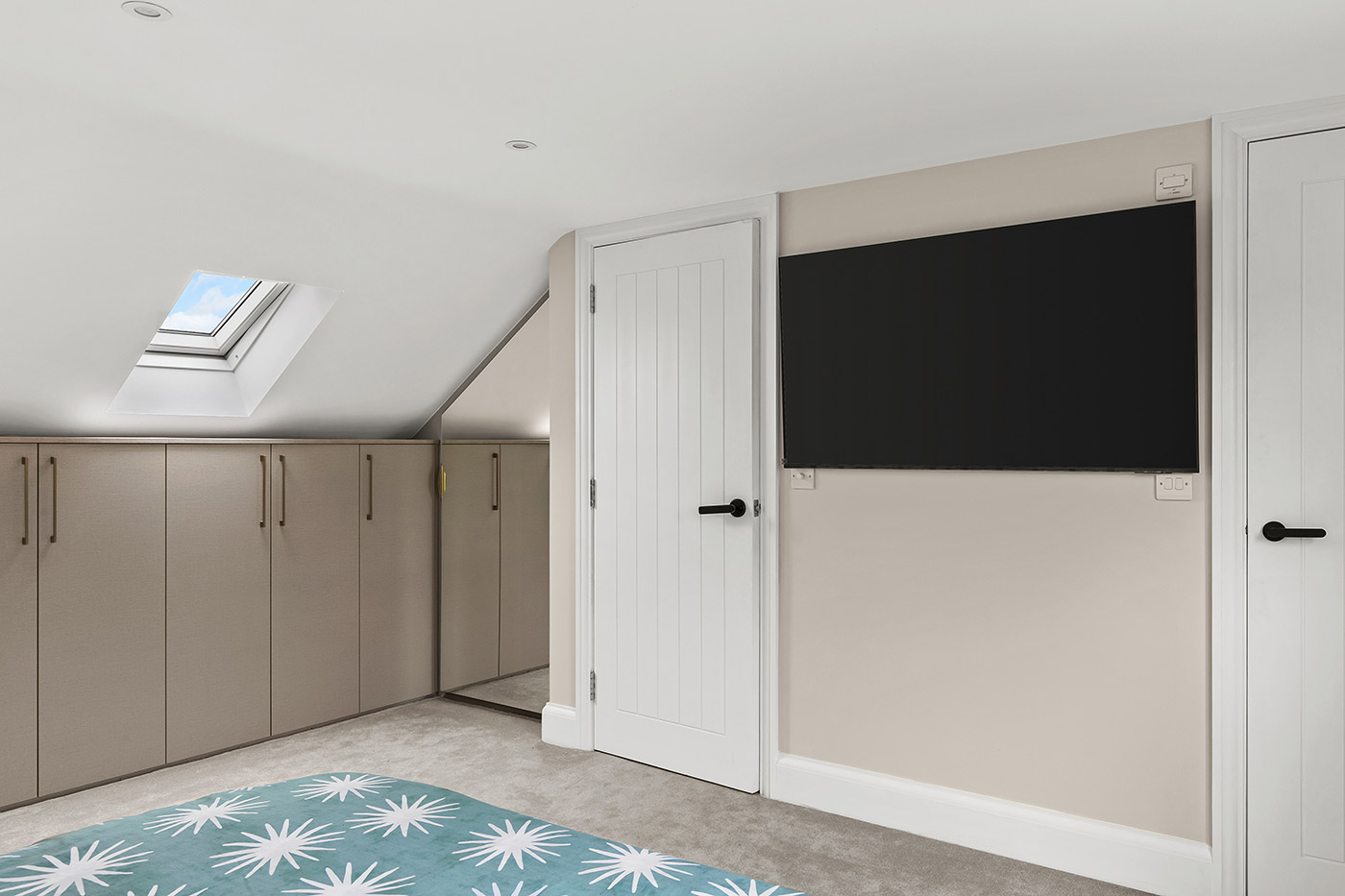 Dormer loft conversion in Potters Bar, Hertfordshire, featuring en-suite shower room and bespoke storage solutions